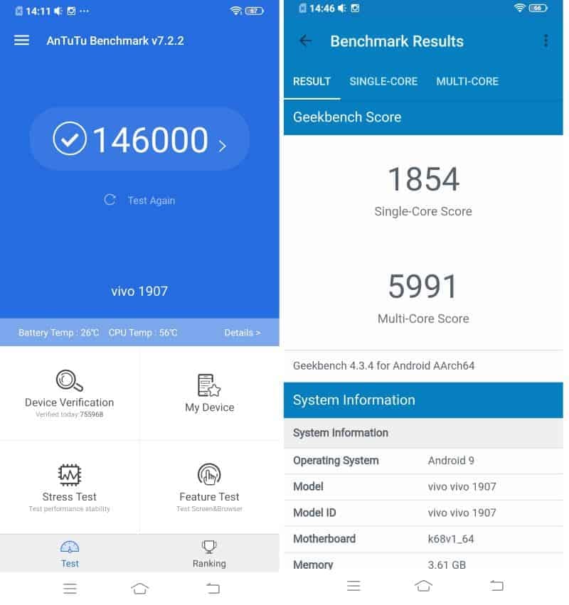 Vivo V15 Geekbench Benchmark Score Results